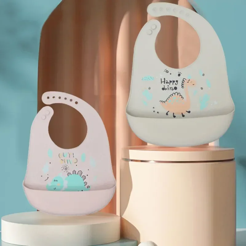 Impermeável Baby Bibs Baby Stuff Cute Cartoon Dinosaur Impresso Crianças Bib Girl Boy Ajustável Soft Silicone Bib Baby Feeding Stuff